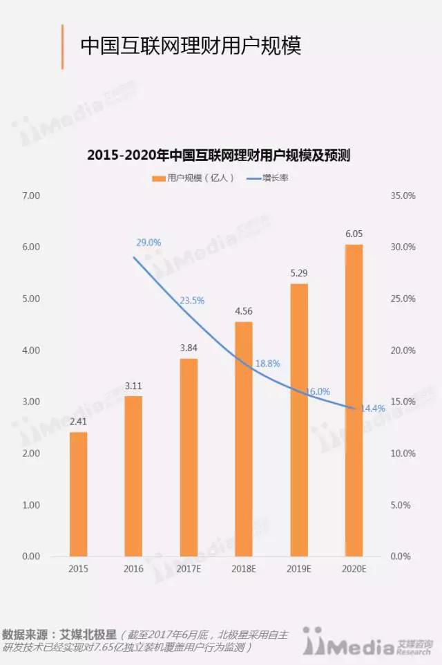 另外,据新经济行业数据挖掘和分析机构iiMedia Research(艾媒咨询)数据显示,2016年,中国互联网理财用户达3.11亿人。预计到2017年底,中国互联网理财用户将达3.84亿,增长率为23.5%。