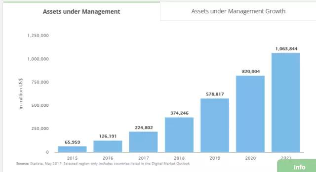 据权威在线统计数据门户Statista数据显示,2017年全球智能投顾管理资产将超2248亿美元,年增长率将高达47.5%,到2021年全球智能投顾管理资产规模将超过1万亿美元。