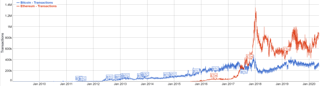 来源:Bitinfocharts.com,《每日比特币/以太坊的确认交易》。