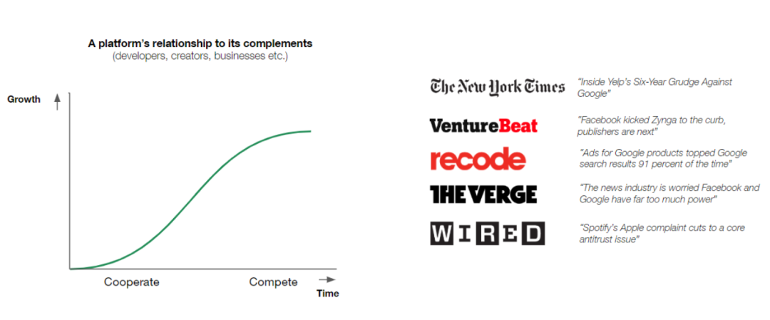 · 平台天然倾向于扼杀创新。对于第三方角度来看,从合作到竞争的过渡使得双方很难维持可持续的业务伙伴关系。这种平台风险的典型例子诸如Spotify与Apple的交恶,其中Apple被指控在App Store中不公平地推广自己的音乐服务。